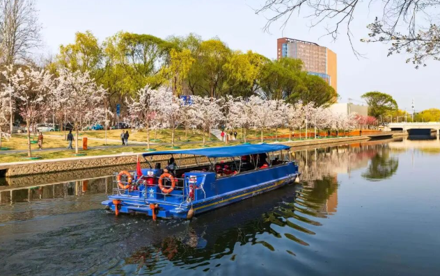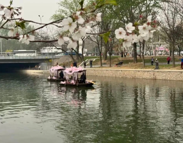 整条航线分为三段,为市民提供了多样化的水上赏樱体验。朝阳文旅集团策划运营部经理朱梦娇介绍,从昆泰码头到东湖船闸段可乘坐观光游船,东湖船闸至北湖船闸段可体验北京首秀的复古汽车船,而北湖船闸至北小河公园段则可乘坐摇橹船。